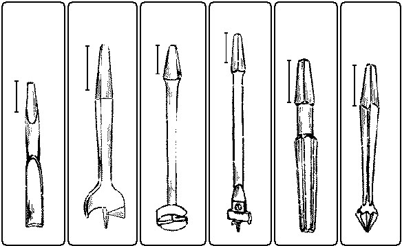 Auger-bits, Fig. 130, have several important features. The spur centers the bit in its motion, and since it is in the form of a pointed screw draws the auger into the wood. Two sharp nibs on either side score the circle, out of which the lips cut the shavings, which are then carried out of the hole by the main screw of the tool. The size of auger-bits is indicated by a figure on the tang in 16ths of an inch. Thus 9 means a diameter of 9⁄16".