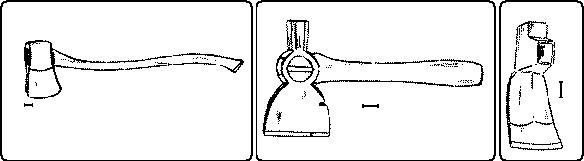 The hatchet has, beside the cutting edge, a head for driving nails, and a notch for drawing them, thus combining three tools in one. The shingling hatchet, Fig. 140, is a type of this.