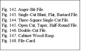 Rasps, Fig. 147, differ from files in that instead of having cutting teeth made by lines, coarse projections are made by making indentations with a triangular point when the iron is soft. The difference between files and rasps is clearly shown in Fig. 149.