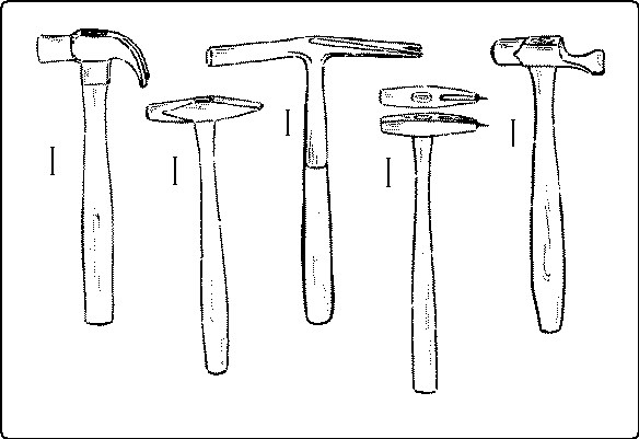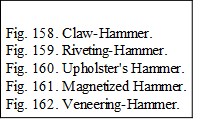 Hammers may be classified as follows: (1) hammers for striking blows only; as, the blacksmith's hammer and the stone-mason's hammer, and (2) compound hammers, which consist of two tools combined, the face for striking, and the "peen" which may be a claw, pick, wedge, shovel, chisel, awl or round head for other uses. There are altogether about fifty styles of hammers varying in size from a jeweler's hammer to a blacksmith's great straight-handled sledge-hammer, weighing twenty pounds or more. They are named mostly according to their uses; as, the riveting-hammer, Fig. 159, the upholsterer's hammer, Fig. 160, the veneering-hammer, Fig. 162, etc. Magnetized hammers, Fig. 161, are used in many trades for driving brads and tacks, where it is hard to hold them in place with the fingers.