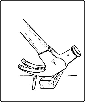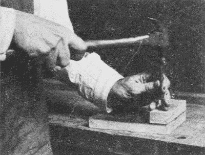 It is essential that the face of the hammer be kept free from glue in order to avoid its sticking on the nail-head and so bending the nail. Hammers should be used to hit iron only; for hitting wood, mallets are used. In striking with the hammer, the wrist, the elbow and the shoulder are one or all brought into play, according to the hardness of the blow. The essential precautions are that the handle be grasped at the end, that the blow be square and quick, and that the wood be not injured. At the last blow the hammer should not follow the nail, but should be brought back with a quick rebound. To send the nail below the surface, a nailset is used. (See below.)