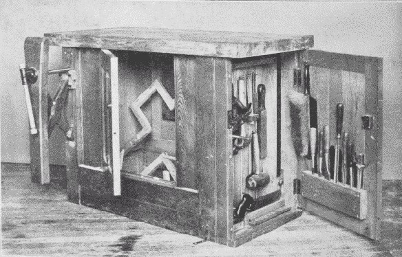 Benches. The essential features of a work-bench are a firm, steady table with a vise and places for tools. The joints are either pinned or wedged mortise-and-tenon, or draw-bolt joints. The best benches are made of maple, the tops being strips joined or tongued-and-grooved together. It is common also to have a trough at the back of the top of the bench, i. e., a space 6" or 8" wide, set lower than the upper surface, in which tools may be placed so as not to roll off. A low pillow, fastened at the left hand end of the trough, on which to set planes in order that the edge of the cutter may not be injured, is an advantage. The tool-rack is of capital importance. It has been common in school benches to affix it to a board, which rises considerably above the top of the bench, Fig. 169, but a better plan is to have the top of it no higher than the bench-top, Fig. 166. Then the light on the bench is not obscured, and when a flat top is needed for large work it can readily be had by removing the tools. Elaborate benches with lock drawers are also much used in the shops of large city schools.