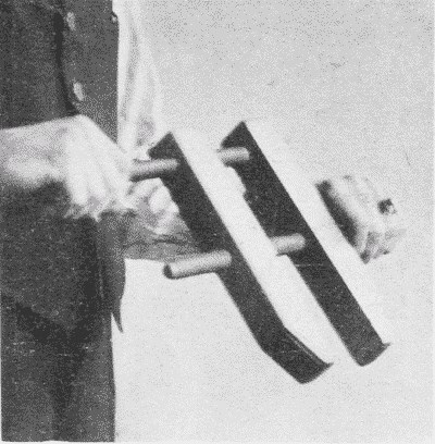 Handscrews, Fig. 173, consist of four parts, the shoulder jaw and the screw jaw, made of maple, and the end spindle and the middle spindle, made of hickory. The parts when broken can be bought separately. Handscrews vary in size from those with jaws four inches long to those with jaws twenty-two inches long. The best kind are oiled so that glue will not adhere to them. In adjusting the jaws, if the handle of the middle spindle is held in one hand, and the handle of the end spindle in the other hand, and both are revolved together, the jaws may be closed or opened evenly, Fig. 174. In use care must be taken to keep the jaws parallel, in order to obtain the greatest pressure and to prevent the spindles from being broken. It is always important to have the jaws press on the work evenly. To secure this, the middle spindle should be tightened first, and then the end spindle. Handscrews are convenient for a great variety of uses, as clamping up glued pieces, holding pieces together temporarily for boring, Fig. 247, p. 152, holding work at any desired angle in the vise, as for chamfering or beveling, Fig. 175, etc.