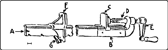 Clamps are made of both wood and iron, the most satisfactory for speed, strength, and durability are steel-bar carpenter clamps, Fig. 176. They vary in length from 1½ ft. to 8 ft. The separate parts are the steel bar A, the cast-iron frame B, the tip C into which fits the screw D, on the other end of which is the crank E, and the slide F with its dog G, which engages in the notches on the bar. Any part, if broken, can be replaced separately.