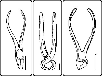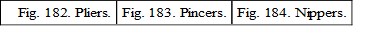 Such tools as pliers, Fig. 182, pincers, Fig. 183, and nippers, Fig. 184, made for gripping iron, are often useful in the woodworking shop. So are various sorts of wrenches; as fixed, socketed, adjustable, monkey- and pipe-wrenches.