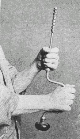 The brace or bit-stock, Fig. 185, holds all sorts of boring tools as well as screwdrivers, dowel-pointers, etc. The simple brace or bit-stock consists of a chuck, a handle, and a knob, and is sufficient for ordinary use; but the ratchet-brace enables the user to bore near to surfaces or corners where a complete sweep cannot be made. It is also useful where sufficient power can be applied only at one part of the sweep. By means of pawls which engage in the ratchet-wheel, the bit can be turned in either direction at the will of the user. The size of the brace is indicated by the "sweep," that is, the diameter of the circle thru which the swinging handle turns. To insert a bit or other tool, Fig. 186, grasp firmly with one hand the sleeve of the chuck pointing it upward, and revolve the handle with the other hand, unscrewing the sleeve until the jaws open enough to admit the whole tang of the bit. Then reverse the motion and the bit will be held tightly in place. Various hand-, breast-, bench-, bow-drills and automatic drills are of use in doing quick work and for boring small holes, Fig. 187.