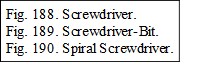 For heavy work, screwdriver-bits, Fig. 189, in a bit-stock are useful, and for quick work, the spiral screwdriver, Fig. 190, and for small work, the ratchet-screwdriver.
