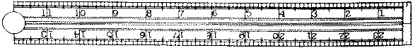 The lumberman's board-rule, Fig. 199. To measure wood by it, note the length of the board in feet at the end of the measure. The dot nearest the width (measured in inches) gives the B. M. for lumber 1" thick.