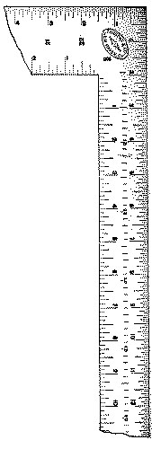 For determining the length of the long side (hypothenuse) of a right angle triangle, when the other two given sides are not equal, the foot rule, or another steel square may be laid diagonally across the blade and arm, and applied directly to the proper graduations thereon, and the distance between them measured on the rule. If the distance to be measured is in feet, use the 1⁄12" graduations on the back of the square.
