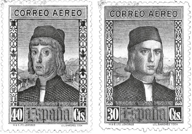 Марки из набора «Открытие Америки» с портретами Мартина и Висенте Пинсонов Испания 1930 г.