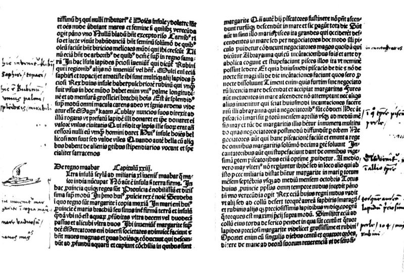 Читая и перечитывая «Образ мира», Христофор постигал основы географии, знакомился с трудами великих ученых. Для него это была чрезвычайно полезная и удобная книга, соединившая мудрость поколений. Колумб сделал сотни пометок на полях фолианта де Айи. В книге содержится 898 маргиналий – кратких рукописных замечаний, большинство из которых принадлежит будущему первооткрывателю. Колумбоведы пронумеровали маргиналии, расшифровали, часто цитируют, обосновывая замыслы мореплавателя. «Образ мира» вдохновил Христофора найти западный путь к богатым азиатским странам. Колумб узнал о них из рукописного текста венецианского купца Марко Поло, называвшегося «Книга о разнообразии мира», или «Книга Марко Поло». В 1485 году Христофору удалось приобрести латинское издание «Книги» (так чаще говорили о ней), когда уже знал в ней каждую строчку. В печатном тексте содержится свыше трех сот маргиналий Колумба. Он выписал распространенные на Востоке товары, цены на пряности, размеры государств, расстояния между ними.