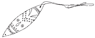 The Bull Roarer is a long, narrow piece of wood with tapering ends that, when attached to a cord and whirled around the head, produces a sound very much like thunder or the bellowing of a bull. It was taboo for woman to see this sacred object, which was used in initiation ceremonies and was regarded as carrying the actual voices of the Spirits.