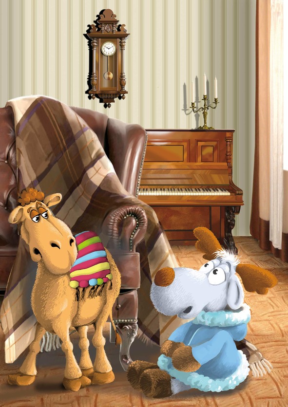 One morning Mike started off on a walk, while Camel stayed home. Camel fussed around the room, pacing back and forth, and just couldn’t get comfortable. Sometimes he stopped, sat down on the rug, stretched out his hooves in front of himself and laid his head on them. Then he would stretch out one hoof from the bunch, scratch behind his ear, sigh deeply, grunt and let out a sustained “Hmmmmmmm…pf!” And after Camel let out his fifth “hmpf!” and scratched himself behind his ear for the third time, a rustling noise came from behind the arm chair. A large plaid throw blanket moved on the floor and Moosie popped out from underneath. He had just woken up and he was trying to scratch his nose with his short little paws, but without much success. He thought the matter over, and began rubbing his nose on the leg of the arm chair, when all at once he saw Camel. The two animals stared at each other.