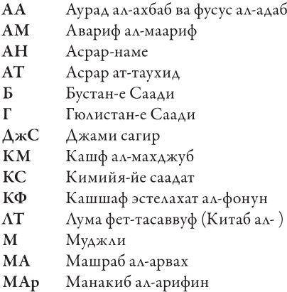 Везде, где это было возможно, введены постраничные отсылки к классическим трудам по суфизму, исключая стихи; в последнем случае заинтересованный читатель может легко найти первоисточник, используя любое из опубликованных изданий и ориентируясь на слово, образующее рифму в оригинальном персидском двустишии.