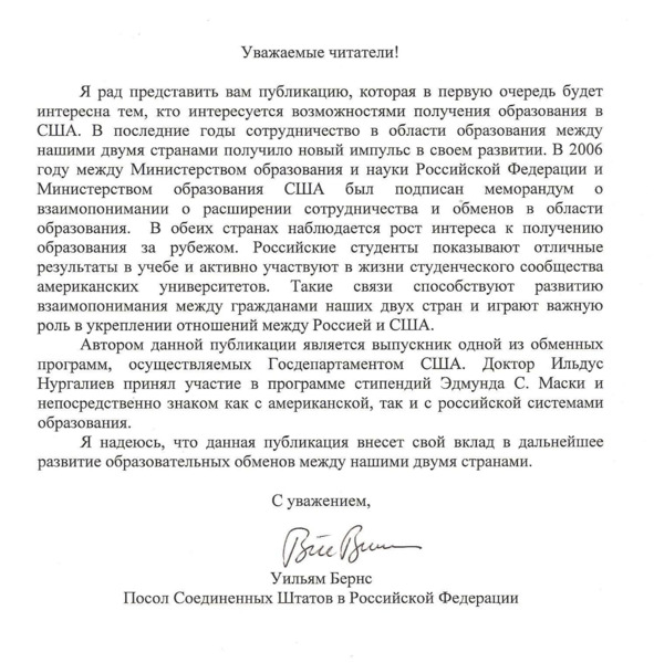 Данная книга о получении высшего образования в США задумана автором в помощь студентам, абитуриентам, их родителям и спонсорам при принятии решения о том, насколько учёба в США может оправдать их ожидания, и о том, как выбрать учебное заведение и программу, наиболее удачно сочетающую предлагаемые курсы с тем отечественным образовательным багажом, которым российский студент уже располагает. Она включает в себя материалы из ранее вышедшей в свет брошюры автора «Учёба в США: как выбрать учебное заведение, найти финансовую помощь, поступить и преуспеть в американском университете. Пособие для российских студентов». Автор продолжает работу над данным материалом и новые версии данной книги, другие публикации автора и его консультации доступны на его сайте nurgaliev.pro. Поэтому, если данное издание до Вас дошло в устаревей версии в этой быстро меняющейся жизни, Вы можете проверить наличие более современной версии через сайт.