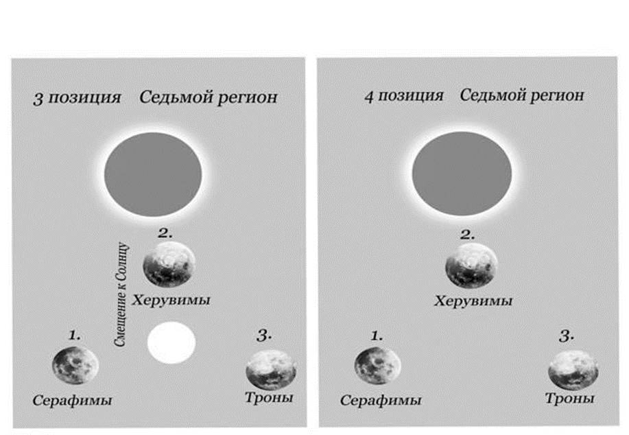 В первом регионе было три Луны, три высокоразвитых цивилизаций. Стояли они напротив настоящего Огненного Солнца. Обитатели трех Лун, во многих Священных писаниях приходят к нам в молитвах как дети Бога: Херувимы, Серафимы и Троны. Серафимы – это, пепельные Боги.