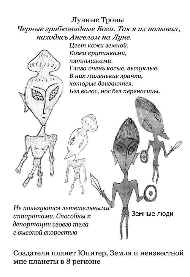 Троны – Черные грибковые Боги. Тело цвета земли. Кожа крупинками, пятнышками. Глаза очень косые, выпуклые, в них тоже есть маленькие глазки, которые шевелятся и не моргают. Тоже без волос. Нос без переносицы, узкий. Разговаривают мыслями и голосом. Очень тонкие, быстрые, легкие проворные. Создатели планет Юпитер, Земля и неизвестной мне планеты в восьмом Регионе.