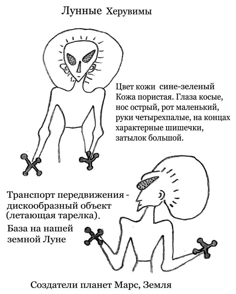 Создатели планет Марс, Земля. На Марсе создали человека по образу и подобию. У Лунных Херувимов кожа пористая – в трещинках, если посмотреть поближе. У меня был опыт видеть это. Быстро летают, но без крыльев, т.е. деформируют свое тело с большой скоростью. Спросите за счет чего? Не знаю.