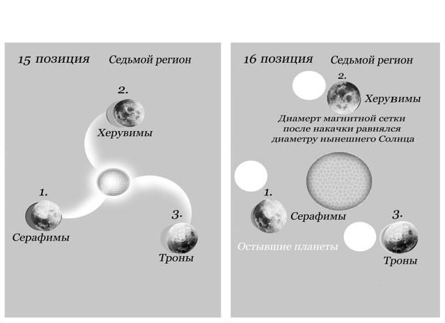 Позиция 11. Боги, т.е. Серафимы, Херувимы и Троны, выполнили задание Бога-отца. Создали все, что было запрограммировано. В центре стояло яркое палящее Солнце. Языки пламени просто качались вокруг ядра. В нашей Солнечной системе стояли три созданные планеты. Голубая планета Юпитер – создатели Троны. Желто-коричневая планета Марс – создатели Херувимы. Зеленая планета Венера – создатели Серафимы.