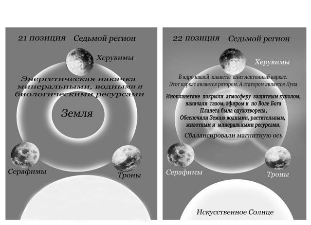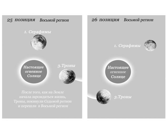 Позиция 26. После того как на планете зародилась жизнь, по волеизъявлению Бога Отца, Лунные Боги Троны покидают свою стоянку в Седьмом регионе и плавно проходят сквозь штору – тьму в Восьмой регион Метагалактики. Создают по тому же сценарию, известному нам, новую планету.