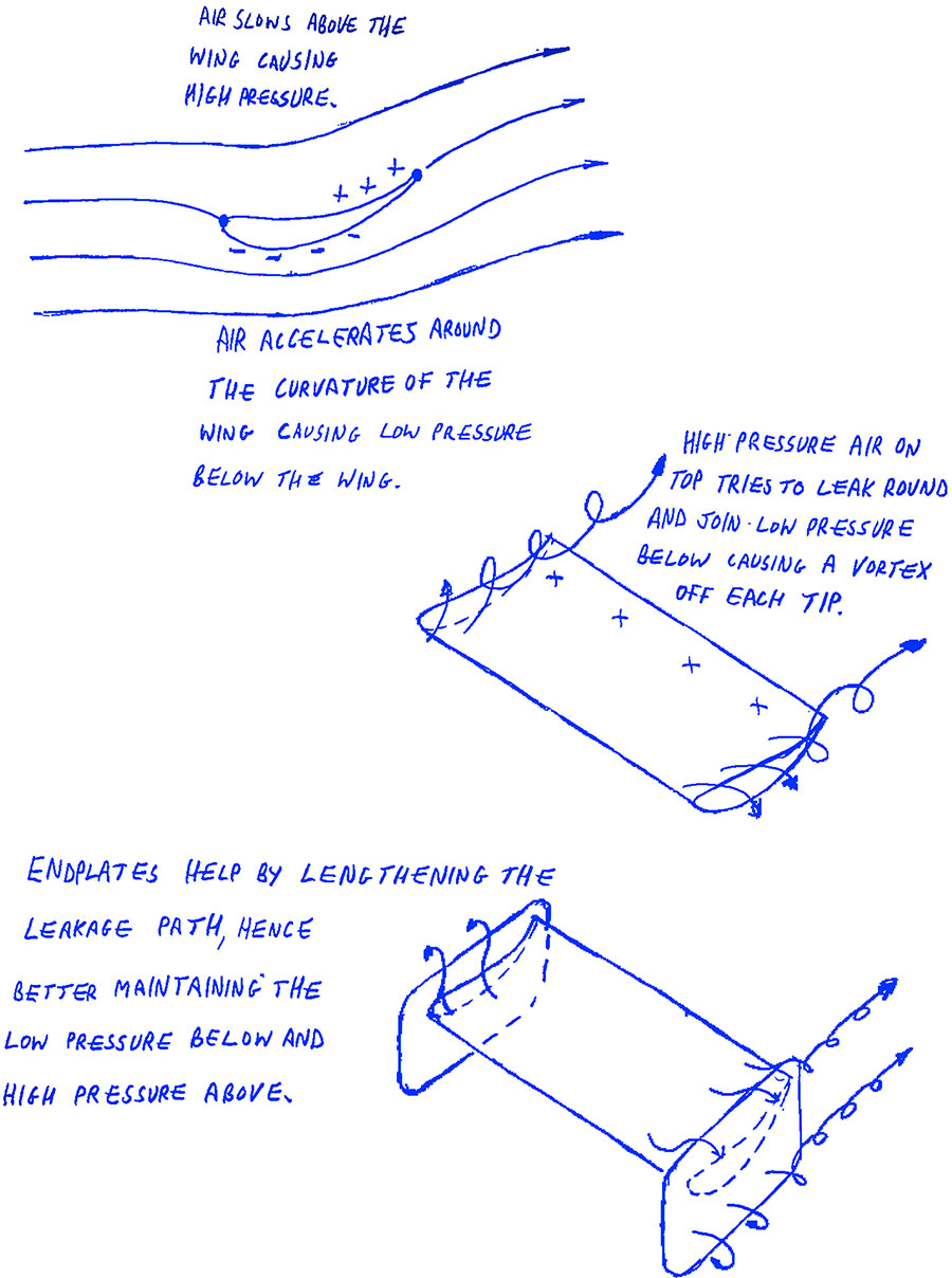 Самолеты (и птицы) решают эту потерю за счет большого размаха крыла. Примером могут послужить планеры, у которых очень длинные и тонкие крылья. Однако в 1968 году, после ряда аварий в Формуле-1, произошедших по причине длинных антикрыльев, появились новые правила, которые ограничивали их размер. Команды ответили установкой торцевых пластин на концы урезанных крыльев. Это позволило добиться более эффективного отвода утекающего воздуха, однако общая эффективность все равно стала ниже. И с 1968 по 1977 год это была самая современная технология в Формуле-1.