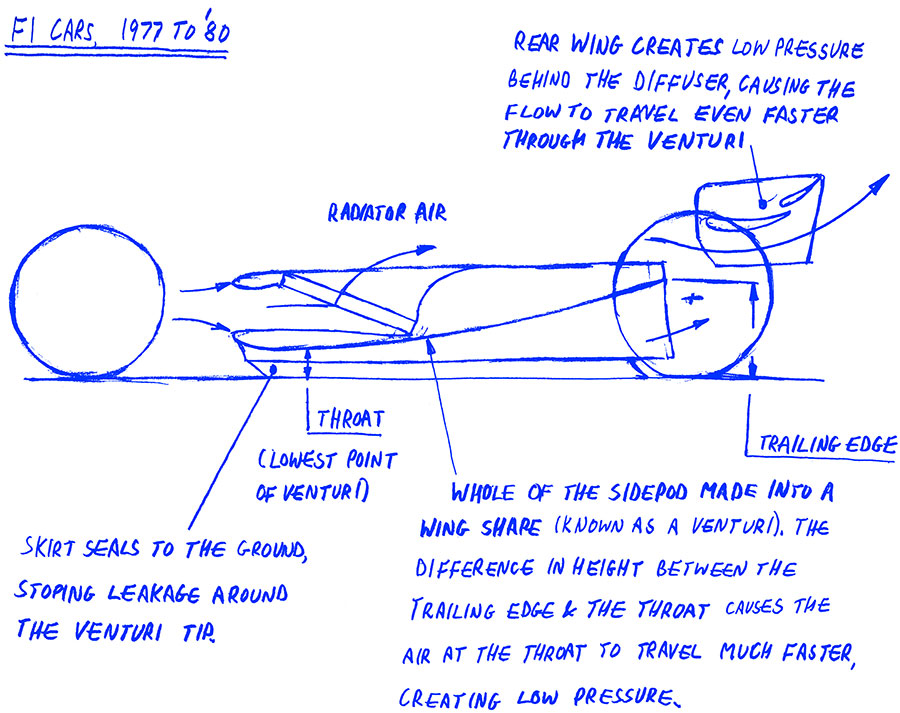 Представьте это вверх ногами и получите генерирующее прижимную силу антикрыло, нижняя кромка которого замыкается в землю, – и вы получите превосходное решение. Именно так поступили в Lotus в 1977 году. Большую часть днища своей машины они превратили в огромное крыло, замыкающееся с асфальтом кончиками «скользящей юбки».