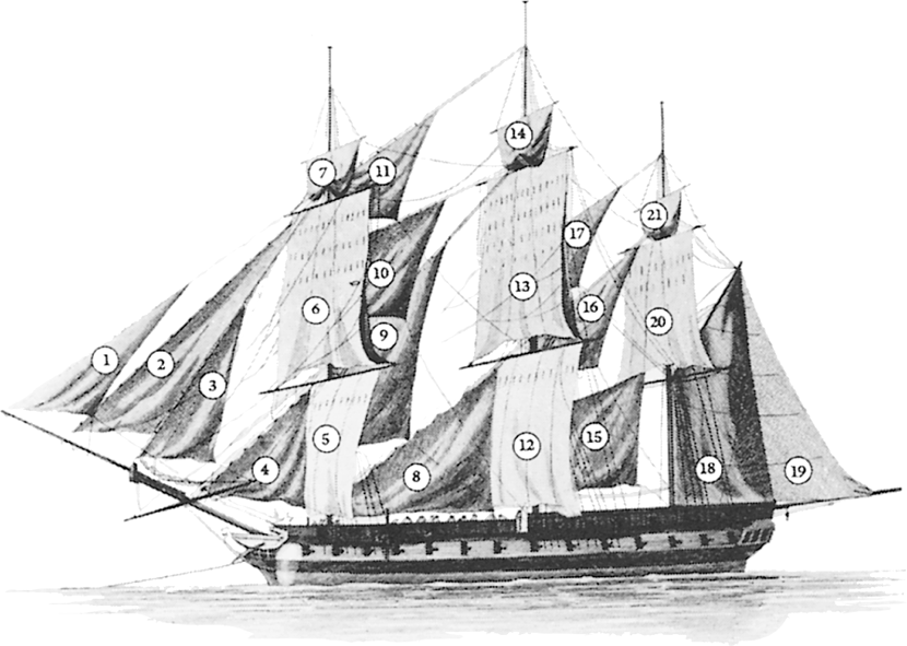 The sails of a square-rigged ship, hung out to dry in a calm.