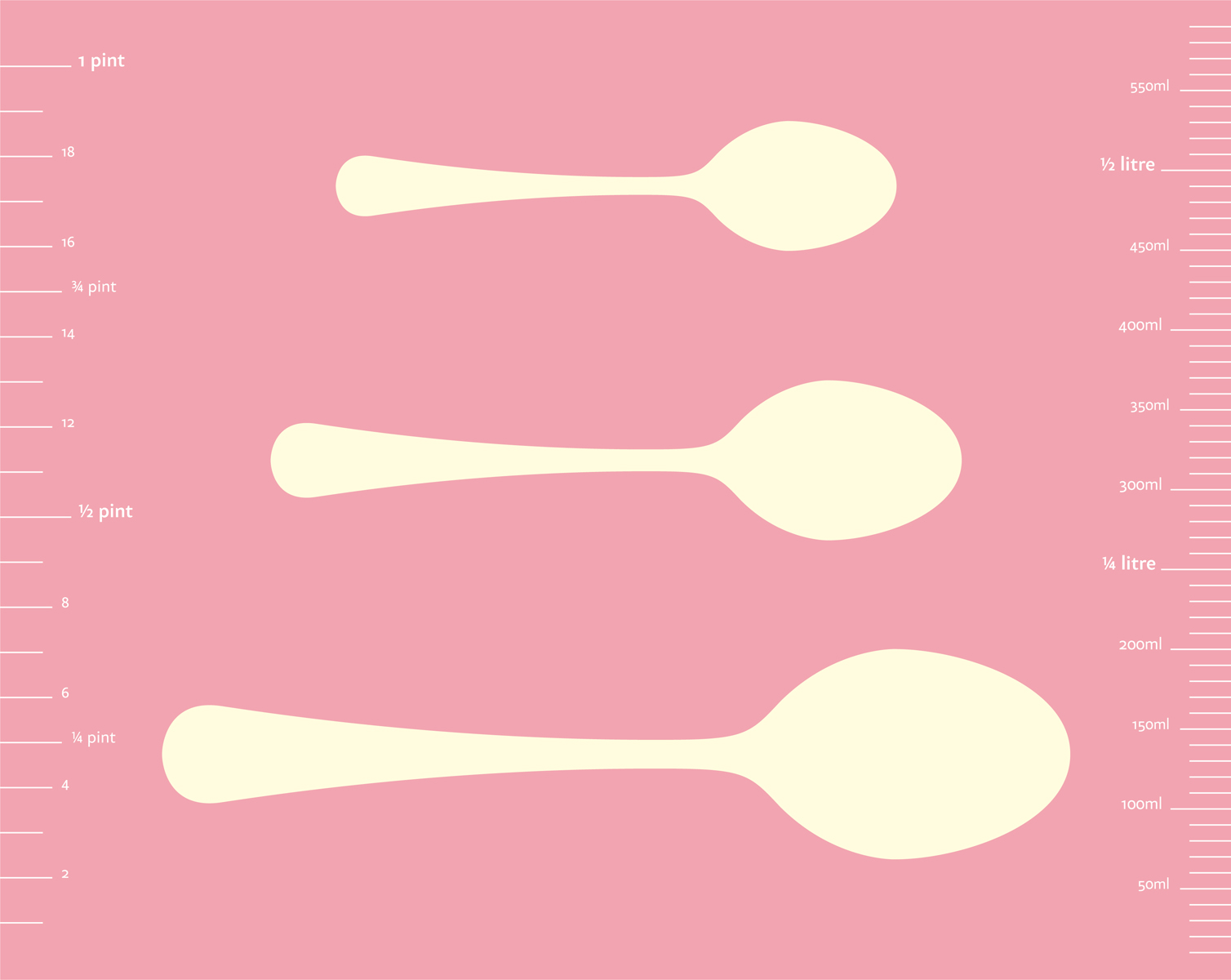 All spoon measurements in this book are rounded unless stated otherwise. ‘Rounded’ means the same volume of ingredient on top of the spoon as below. For example, a rounded spoon measurement is the same as two level spoon measurements.