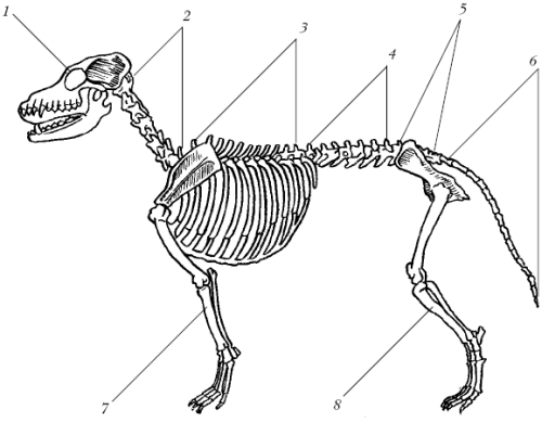Скелет собаки: 1 – черепная коробка; 2 – шейный отдел позвоночника; 3 – грудной отдел позвоночника; 4 – поясничный отдел позвоночника; 5 – крестцовый отдел позвоночника; 6 – хвостовой отдел позвоночника; 7 – кости передних конечностей; 8 – кости задних конечностей