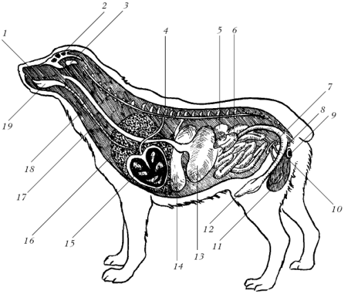 Внутреннее строение среднеазиатской овчарки: 1 – носовая полость, 2 – головной мозг, 3 – мозжечок, 4 – спинной мозг, 5 – селезенка, 6 – тонкий отдел кишечника, 7 – почки, 8 – анальное отверстие, 9 – анальные железы, 10 – мочевой пузырь, 11 – мошонка, 12 – пенис, 13 – желудок, 14 – печень, 15 – сердце, 16-легкие, 17 – пищевод, 18-трахея, 19 – ротовая полость