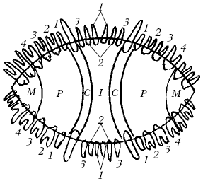 Расположение зубов у среднеазиатской овчарки: I – резцы; С – клыки; Р – премоляры, или предкоренные зубы; М – моляры, или коренные зубы