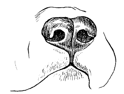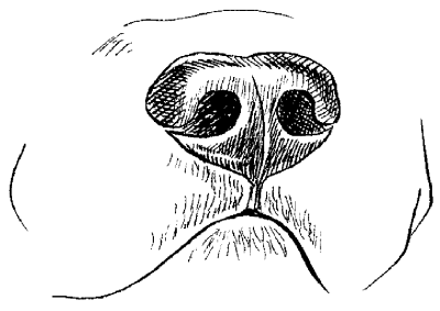 Верхняя губа представляет как бы одно целое с мочкой носа. Следует отметить, что у здоровой собаки мочка носа прохладная и влажная на ощупь, при повышении температуры тела животного она становится теплой и сухой.