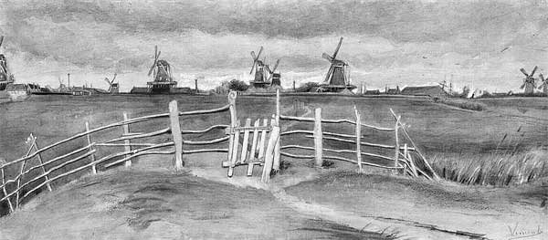 Винсент Ван Гог. Ветряные мельницы близ Дордрехта. Перо, чернила, акварель, графитный карандаш, мел. Август 1881. Музей Крёллер-Мюллера, Оттерло