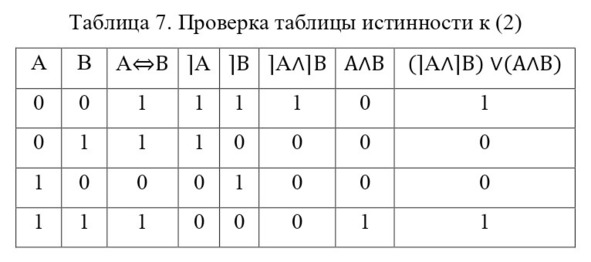 То есть импликацию можно представить как отрицание первого и дизъюнкцию со вторым утверждением, а эквиваленцию как конъюнкцию отрицаний обоих суждений на дизъюнкцию конъюнкции обоих суждений. Если же проверить на таблице истинности (1) и (2), то результат будет действительным (Табл. 6-7).