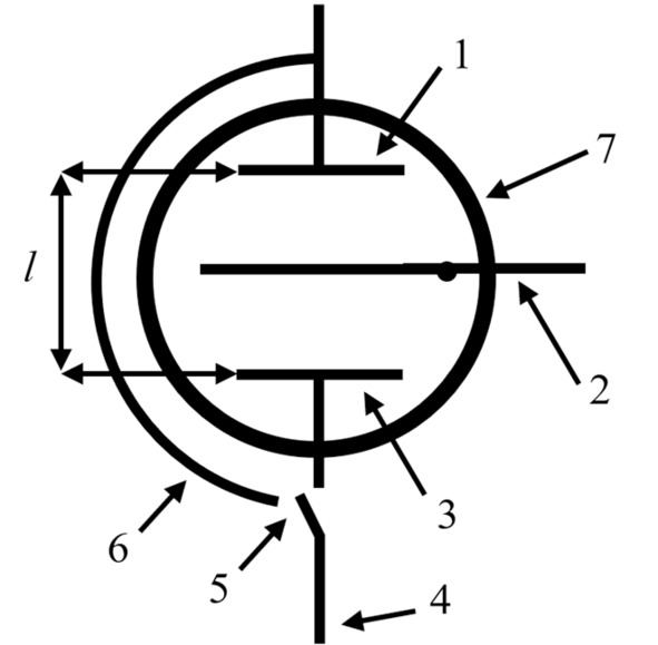Первое устройство – импликатор, состоит из вакуумной колбы 7 с катодом 3 и анодом 1, между коими помещена анодная сетка 2. Расстояние между катодом и анодом l выверено с той точностью, что оно меньше, либо равно свободному пробегу электронов, вылетевших из катода до анода. Также имеется изолированный электрод 6, подведённый с внешней стороны (за колбой) к штырю катода 3, но не соединённый с ним (Рис. 4).