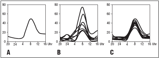 Kortisolwerte vor und nach dem Erden Bei nicht gestressten Menschen hält sich die normale Kortisolausschüttung innerhalb von 24 Stunden an ein vorhersagbares Muster – am niedrigsten ist sie um Mitternacht und am höchsten um 8 Uhr morgens (Grafik A). Die Aufzeichnung vor dem Erden (Grafik B) zeigt höchst unterschiedliche Muster der Versuchsteilnehmer. In Grafik C sieht man die veränderten Muster der Teilnehmer nach dem Erden, die eine signifikante Stabilisierung der Kortisolwerte zeigen. Bei sieben Versuchspersonen wurde ein Rückgang der nächtlichen Kortisolausschüttung festgestellt, die anfangs hoch bis außerhalb des Messbereichs war; der Rückgang betrug durchschnittlich 53,7 Prozent. Bei sechs Teilnehmern stieg der Wert um 8 Uhr morgens um 34,3 Prozent auf den Normalwert an; und bei zwei Personen mit abnorm hohen Werten um 8 Uhr morgens sank der Wert um durchschnittlich 38 Prozent. (Zahlen nach The Journal of Alternative and Complementary Medicine, 2004)