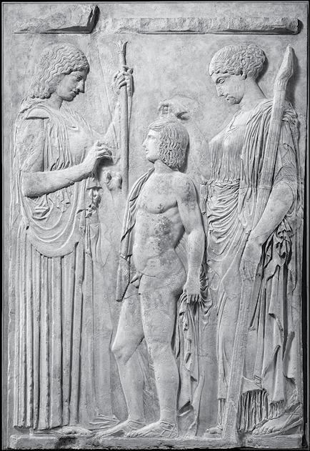 Деметра приходилась старшей сестрой и Зевсу, и Гере, что не избавило ее от настойчивого эротического внимания младшего брата. Результатом этой очередной кровосмесительной связи явилась очаровательная Персефона, любительница шумных компаний подружек-океанид и веселых пикников на берегу лазурного моря. Собственно, там ее и увидел владыка подземного царства Аид, воспылал страстью и, не тратя время и силы на ухаживания и флирт, просто взял, да и украл Персефону, чтобы взять себе в жены. Возник скандал; Деметра обратилась к другим богам за помощью и поддержкой, но тут выяснилось, что похищение Персефоны было совершено с одобрения самого Зевса. Опечаленная и раздосадованная Деметра ушла с Олимпа, приняла облик простой смертной, а заодно сняла свое благословение с природы, и на Земле прекратился всякий рост: завяли листья, поблекла трава, поля стояли без урожая, сады – без плодов, словно в мире воцарился вечный унылый ноябрь. Скоро повсюду наступил голод; масштаб катастрофы грозил существованию самой жизни. Зевс попытался договориться с Деметрой, но безуспешно – а как могло быть иначе? В итоге договариваться пришлось с Аидом: тот согласился отпустить свою пленницу к матери, но перед тем дал ей проглотить зернышко граната – символ супружеской верности. Теперь Персефона не могла навсегда покинуть своего мужа Аида. Две трети года она проводит с матерью – и тогда расцветает природа, зеленеют деревья, радуются теплу и солнцу люди и звери; но потом, хоть и ненадолго, Персефона возвращается в подземелья, и тогда снова дышит холодом осень, листья падают на замерзшую землю багрово-желтым покровом, а небо затягивает пелена дождей и снегопадов. Слева Деметра, одетая в пеплос и гиматион (плащ) и держит скипетр, справа – Персефона, одетая в хитон и гиматион. Богини протягивают правую руку к обнаженному юноше. Считается, что мальчиком был Триптолемос, которого Деметра послала, чтобы учить мужчин выращивать зерно