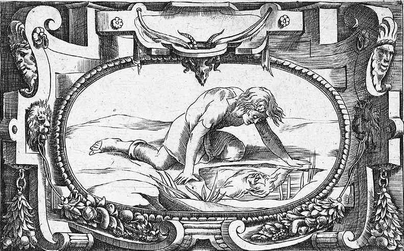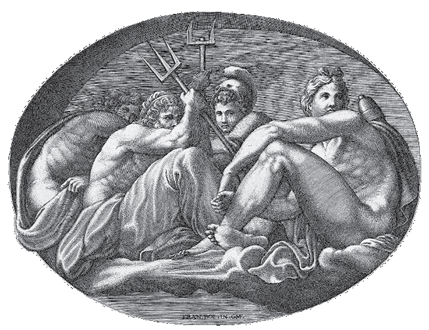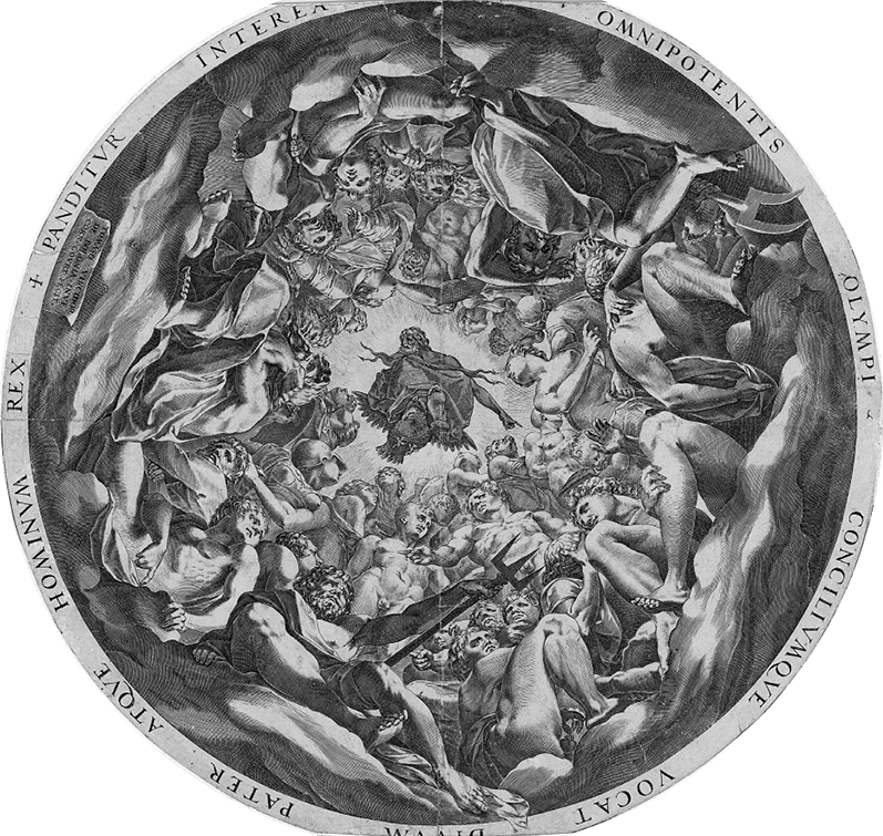 Аполлон, Нептун, Плутон и Афина, сидящие на облаке под аркой. Гравюра по Франческо Приматиччо (1504/5–1570)