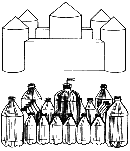Для этой игры нужно набрать некоторое количество бутылок из-под лимонада. Нарисуйте линию старта. Именно оттуда игроки будут бросать мяч. На некотором расстоянии от старта установите горки, составленные из пластиковых бутылок. Например, такой замок в бутылочном варианте может выглядеть так.