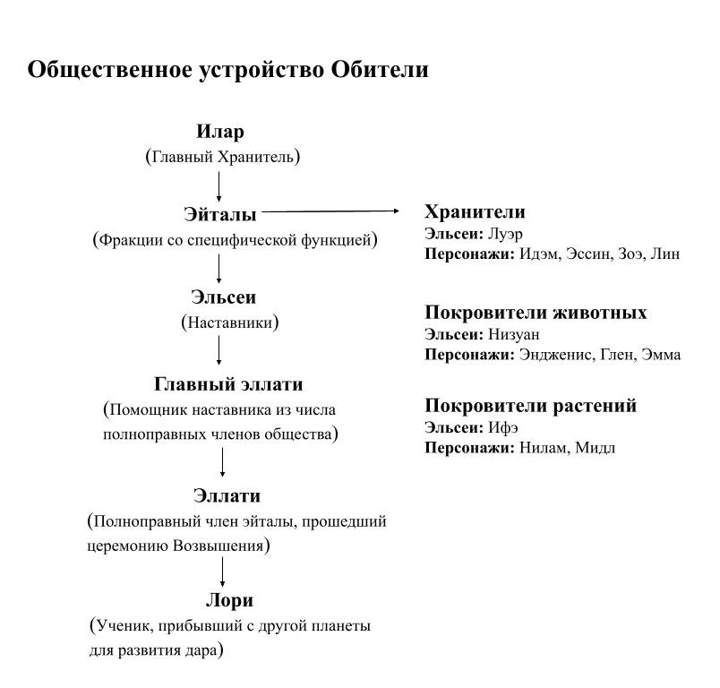 Внутри каждой эйта́лы существует иерархия: эльсе́и – наставники, главные элла́ти – их помощники, элла́ти – полноправные члены общества со своей функцией и ло́ри – ученики. Обителью управляет Главный Хранитель Илар.