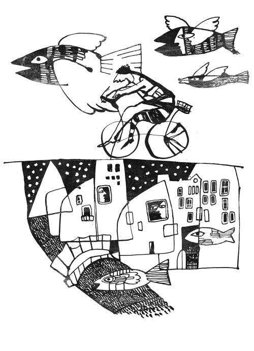 Ты едешь и улыбаешься. И все думают, что ты идиот. Икар на велосипеде. У тебя нет работы, тебе не хватает на краски и на еду. Надо срочно ловить рыбу, её можно есть и рисовать, ещё на ней можно улететь в Витебск или Париж.