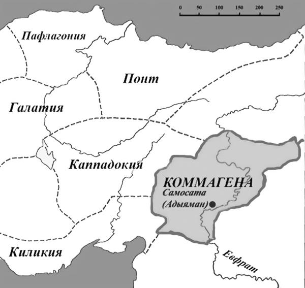 В позднеэллинистический и раннеримский периоды (II в. до н. э. – I в. н. э.) на этой территории располагалось царство, где правила побочная ветвь сатрапской династии Оронтидов, главные представители которой управляли Великой Арменией до начала II в. до н. э., пока ей на смену не пришла династия Арташесидов[33]. Коммагена контролировала одну из важных переправ через Евфрат[34]. Как независимое царство Коммагена появилась на политической карте эллинистического Востока примерно в 164–163 гг. до н. э., выделившись из слабеющей Селевкидской державы, когда стратег этого административного округа, Птолемей, объявил себя царем (Diod. XXXI. 19a). Единственным, правда, и в конечном счете неудачным внешнеполитическим актом Птолемея Коммагенского, о котором мы знаем, является его попытка отторгнуть от Каппадокийского царства область Милетену (Diod. XXXI. 19a), граничащую с Коммагеной на северо-востоке. Уже со времени правления Птолемея царская столица располагалась в Самосате – наиболее крупном городе государства (Strab. XVI. II. 3)[35].