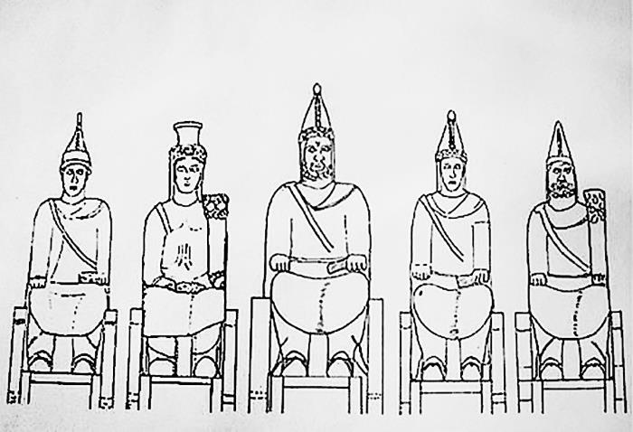 Рис. 4. Предполагаемая реконструкция скульптурных изваяний Западной террасы Нимруд-Дага. Справа налево: царь Антиох I, богиня Коммагена, Зевс-Оромазд, Аполлон-Митра-Гелиос-Гермес, Артагн-Геракл-Арес.