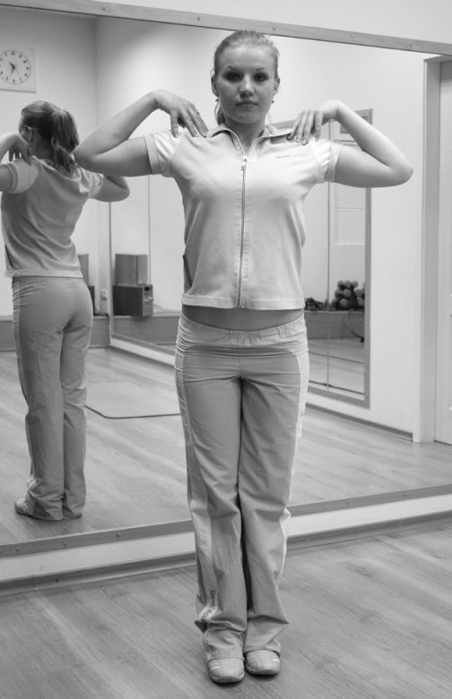 3. Встаньте прямо. Ноги поставьте на ширине плеч, а кисти рук, согнутых в локтях, положите на плечи. Поднимите руки вверх, встаньте на носки, поднимите голову и посмотрите на поднятые ладони. Затем руки опустите на плечи. Поднимая руки, делайте вдох. Возвращаясь в исходную позицию, выдыхайте. Повторите 7–10 раз (фото 1).