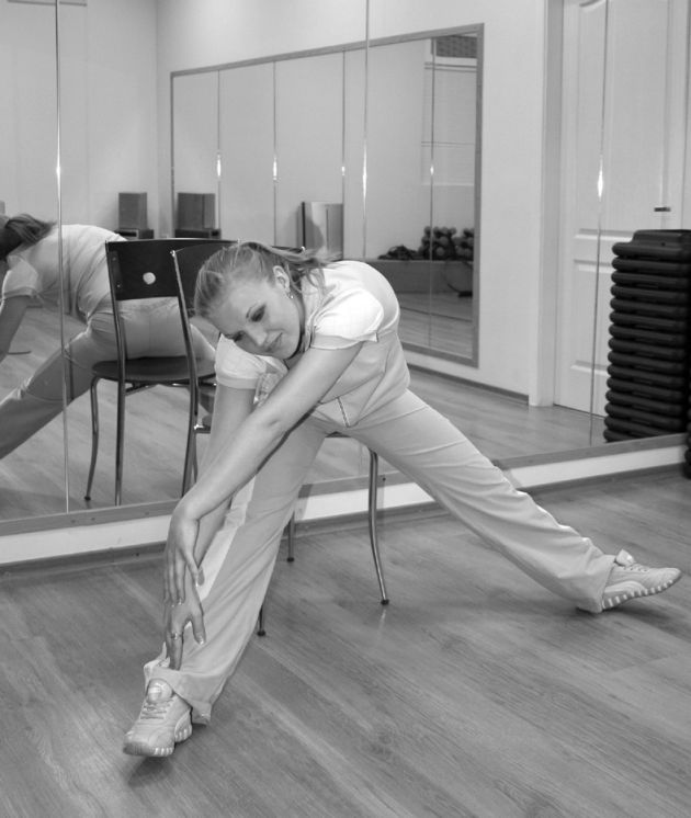 6. Сядьте на стул, широко расставьте ноги. Наклоните корпус сначала к одной ноге, стараясь достать руками до носка, выпрямитесь, затем сделайте наклон к другой ноге. Сидя, делайте вдох, наклоняясь, – выдох. Делайте 10–15 раз (фото 3).