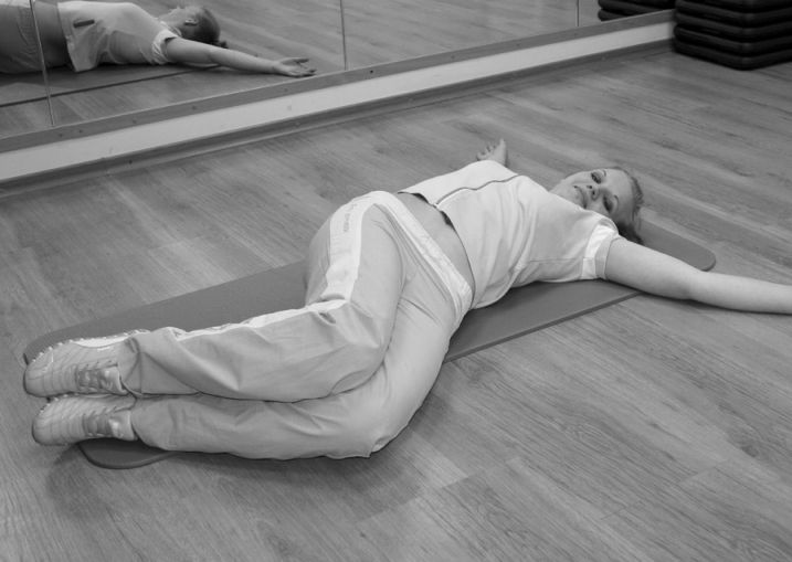 9. В положении лежа на спине согните ноги, прижмите их друг к другу и поставьте стопы на пол. Руки выпрямите и разведите в стороны, положите на пол. Опустите согнутые ноги в сторону, постарайтесь дотронуться коленом пола. Затем примите исходное положение и наклоните ноги в другую сторону. При наклоне делайте вдох, поднимая согнутые ноги, – выдох. Выполняйте упражнение 8–10 раз (фото 5).