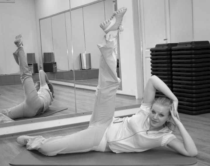 10. Лягте на пол на правый бок. Правую руку согните в локте, поставьте на пол и положите на нее голову. Поднимите выпрямленную левую ногу и делайте ею махи вверх. Затем перевернитесь на левый бок и повторите махи правой ногой. Во время упражнения дышите произвольно. Выполняйте 25–30 махов каждой ногой.