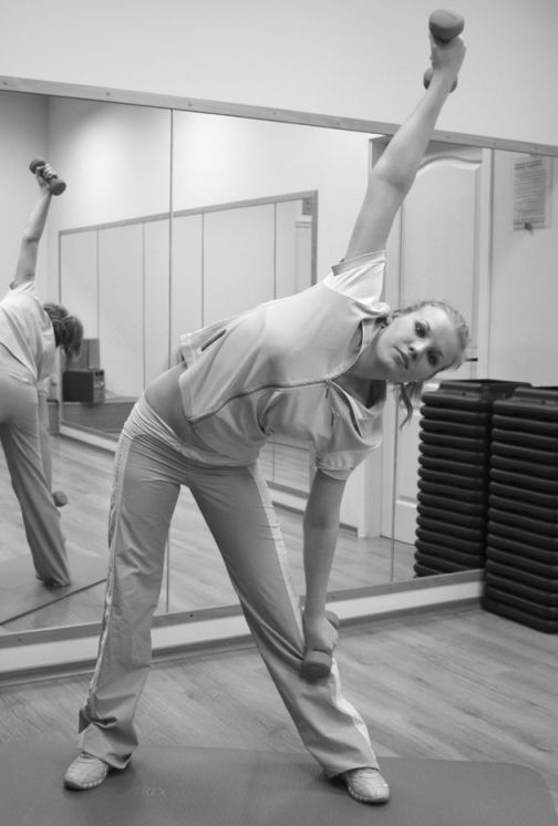 3. Упражнение для живота. Встаньте прямо. Поставьте ноги на ширину плеч. В каждую руку возьмите по гантели весом 1,5–2 кг. Напрягая мышцы живота, медленно наклоните туловище в правую сторону. Левую руку, чуть согнутую в локте, приподнимите вверх. Выпрямитесь, затем наклонитесь в левую сторону, а правую руку приподнимите вверх. Выполняйте наклоны 15 раз в каждую сторону (фото 7).