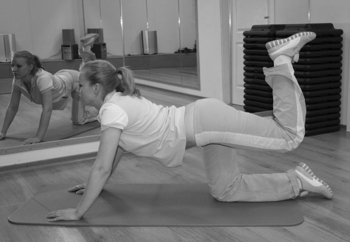 10. Упражнение для живота и бедер. Встаньте на пол на колени, выпрямленными руками обопритесь впереди себя о пол. Согнутую в колене правую ногу поднимите вверх (колено должно быть направлено в сторону), отведите ее в сторону, вернитесь в прежнее положение. Затем опустите на пол. Делайте махи ногой в стороны 10 раз. Затем правую ногу поставьте на пол, а левой сделайте 10 махов. Каждой ногой сделайте по 30 махов в стороны, периодически меняя их (фото 10).
