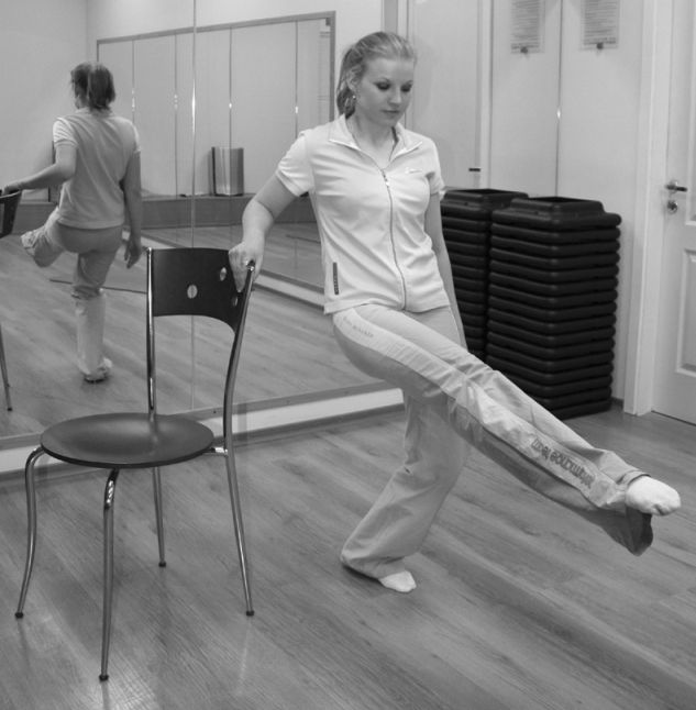 18. Упражнение для внутренней стороны бедер. Встаньте прямо. Сделайте махи правой ногой. Поднимайте ногу как можно выше. Затем сделайте махи левой ногой. Если вам сложно выполнять упражнение без поддержки, сзади себя можете поставить тяжелый стул и придерживаться руками за его спинку. Выполняйте 15 раз каждой ногой.